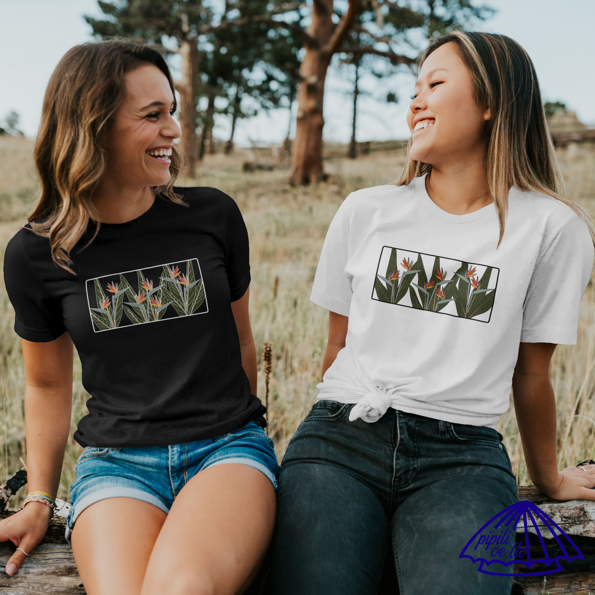 The bird of paradise flower is commonly used in Hawaii used for flower arrangements. Although native to South Africa and not the islands, this flower is a common sight in Hawaii and some consider it a tropical flower. This design was inspired by the art of block printing.